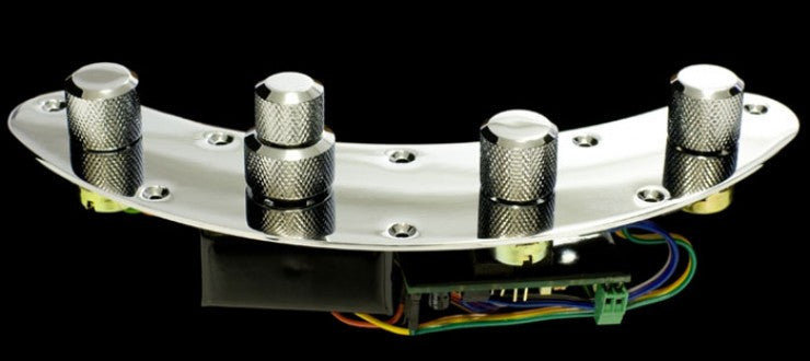 Bei der BTB-MMSR 4 Knob ermöglicht ein Parametrik Doppelpoti mehr Kontrolle des Mittenbereichs. Auch Bässe und Höhen kommen mit Doppelpoti, deshalb kann auch diese Einheit auf einem normalen MM Kontrollblech Platz finden. Die Buchse muss dann seitlich herausgeführt werden.